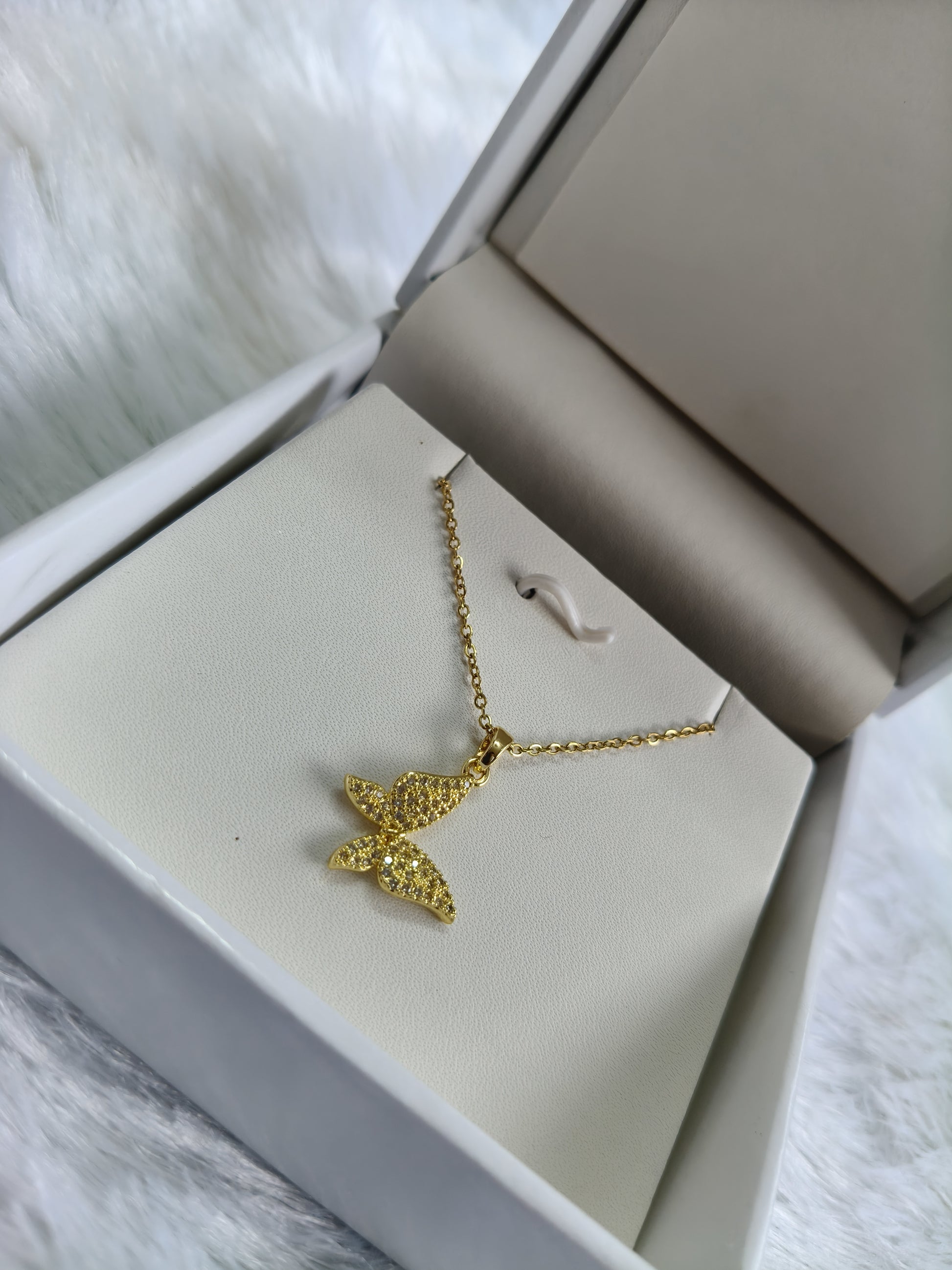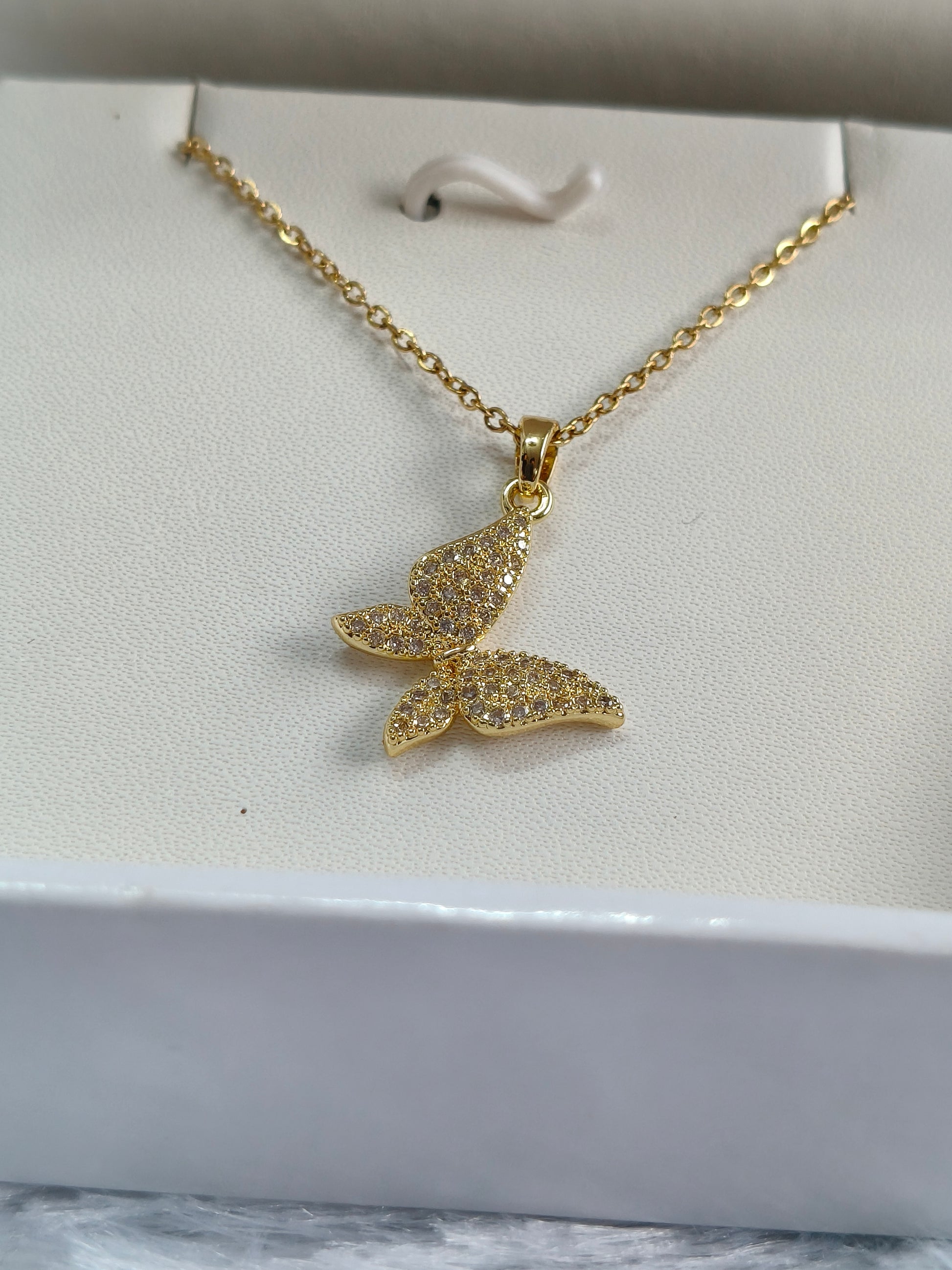A stunning butterfly-shaped pendant crafted with premium gold plating and encrusted with dazzling cubic zirconia stones. This elegant necklace beautifully blends charm and sophistication, symbolizing freedom, transformation, and beauty. Perfect for daily wear, parties, and gifting.