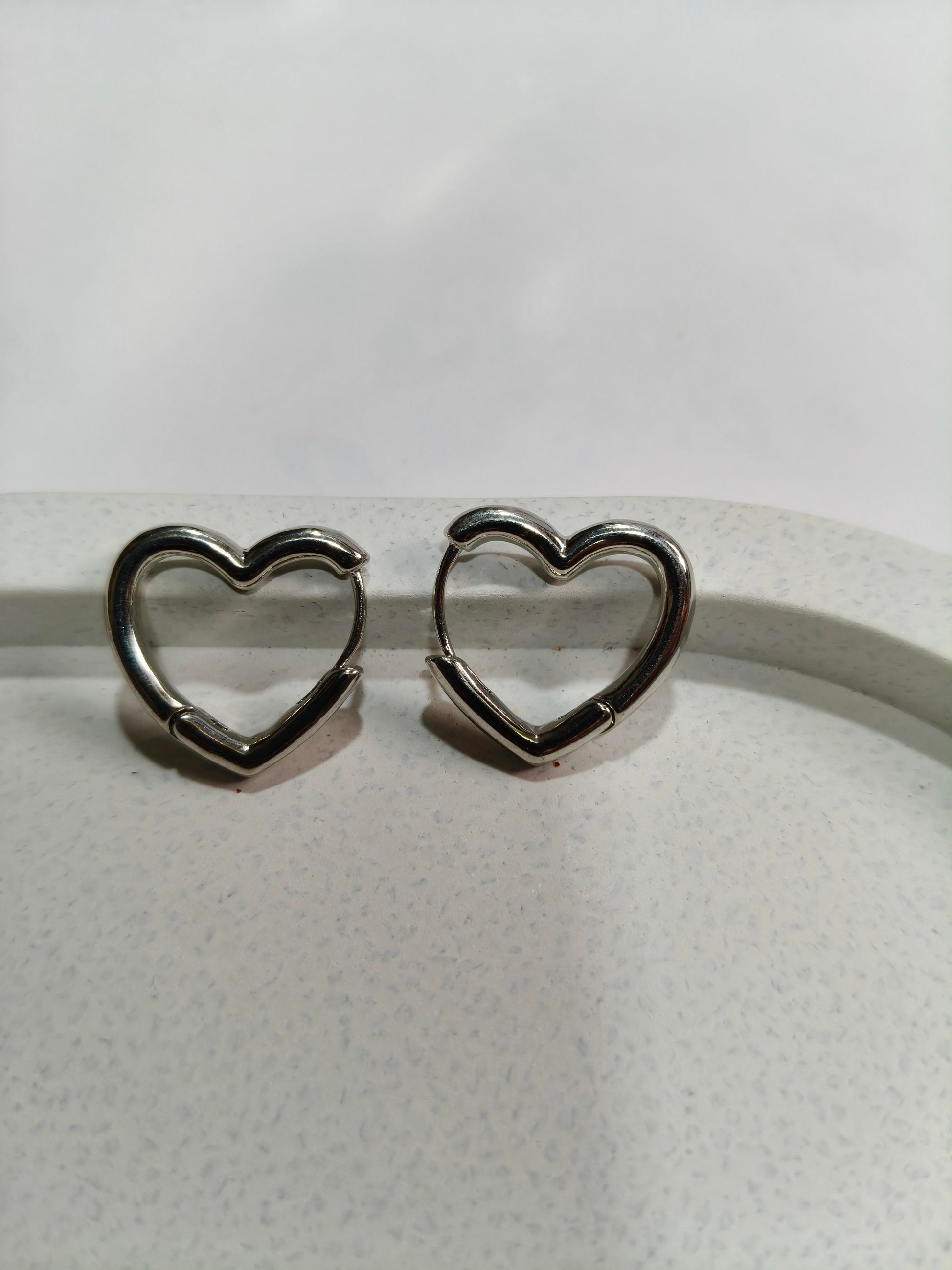 Show off your style with these chic silver heart-shaped hoop earrings. Designed with a sleek, modern finish, they are lightweight, comfortable, and perfect for daily wear or special occasions. Their unique heart design adds a playful yet elegant touch, making them a versatile accessory for every outfit.