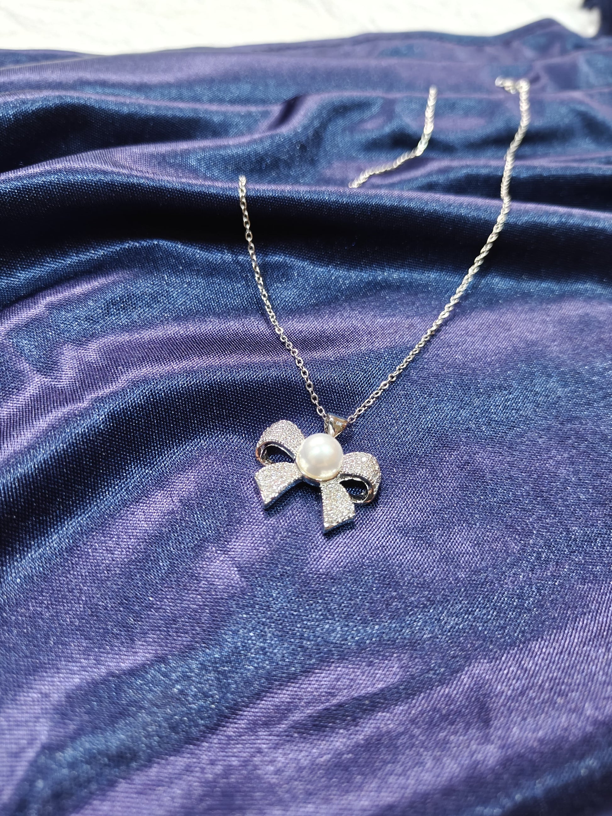 Elegant Bow Pearl Pendant Necklace for Women – Silver Plated with Cubic Zirconia
